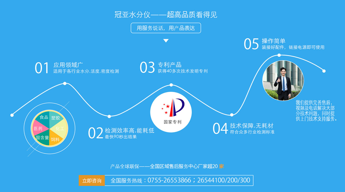 ? ? ? ? 冠亞集團主導的三大系列水分儀已被個人、企業、大專院校、科研機構、質監部門廣泛應用于糧食收購、食品加工、畜禽肉類、農副產品、生物醫藥、化工原料、環保電力、塑膠橡膠、無機粉體、陶瓷建材、紡織纖維、造紙包裝等行業;三大系列中的多個產品已處于國際領先地位,如塑膠水分測定儀、碳酸鈣水分儀、石膏結晶水測定儀、食品水分檢測儀、肉類快速水分儀、糧食水分儀、飼料水分測定儀、醫藥快速水分儀、化工原料水分儀、污泥含水率檢測儀、電池漿料水分儀、固含量檢測儀等填補了國內高端水分儀應用領域的空白,并已逐漸替代進口產品,打造了業內知名的“冠亞”品牌和“SFY”品牌。